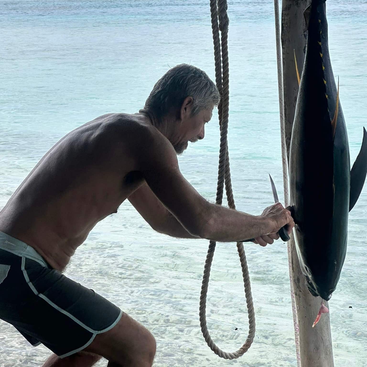 On the way to Oneata, we made a stops at a deserted reef in the open ocean for spearfishing a big tuna. Entering Oneata lagoon, we found a perfect anchorage framed by turquoise water. Kai became good friend with a local boy and we all got invited for a cricket game. Finally, we shared the catch of the day on the beach with our new cricket game friends. The next day, David and Charla join a local fisherman for an unforgettable fishing trip, learning traditional techniques and forming lasting memories. It looks like Charla has discovered a new passion with fishing.